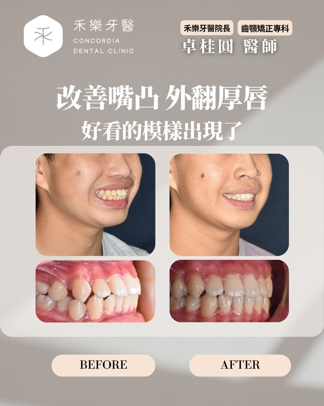 「很多人以為是嘴型的問題,其實關鍵在牙齒。」院長卓桂圓醫師利用患者天生缺牙的空間,結合額外拔牙策略,精準打造足夠的退牙距離,讓門牙能順利回到理想位置。